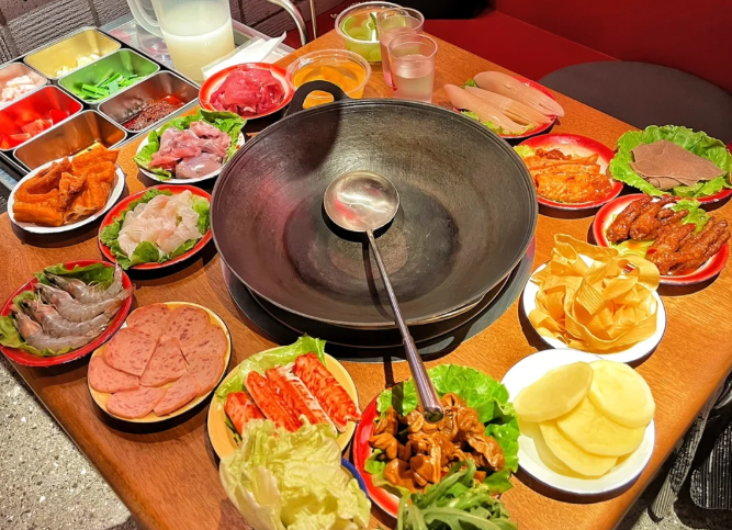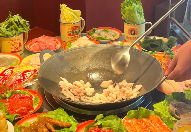 产品与场景差异化竞争力主打源于贵州农村赶集文化的地摊现炒火锅,以 “现炒猪油锅 + 拌饭” 为核心记忆点 —— 用鲜切猪肉入铁锅爆香出油,搭配辣椒面、豆豉等秘制配料现场炒制锅底,还原 “小时候的味道”,契合当代消费者对烟火气与怀旧感的需求。产品矩阵覆盖红油、骨汤、菌汤等多口味锅底,搭配鲜切猪肉、毛肚、菌菇等食材,同时推出 “火锅 + 夜市小吃” 复合模式,增设烤串、炸物等品类,实现 “正餐 + 快餐 + 宵夜” 全时段经营,单店营收渠道更丰富。门店采用苹果银不锈钢门头搭配高饱和度红色装饰,设置 “飞猪” 造型打卡点与客座休息区,强化视觉辨识度,激发顾客社交分享欲,自然提升曝光量。